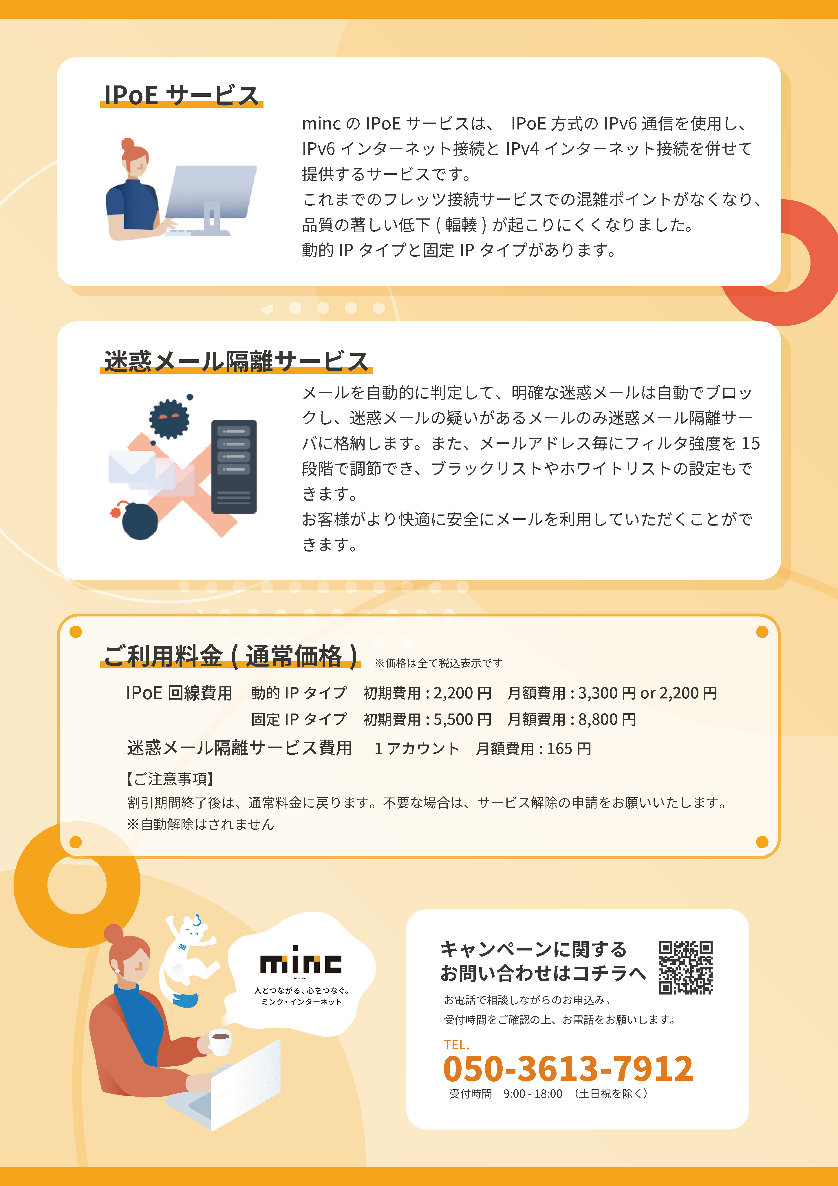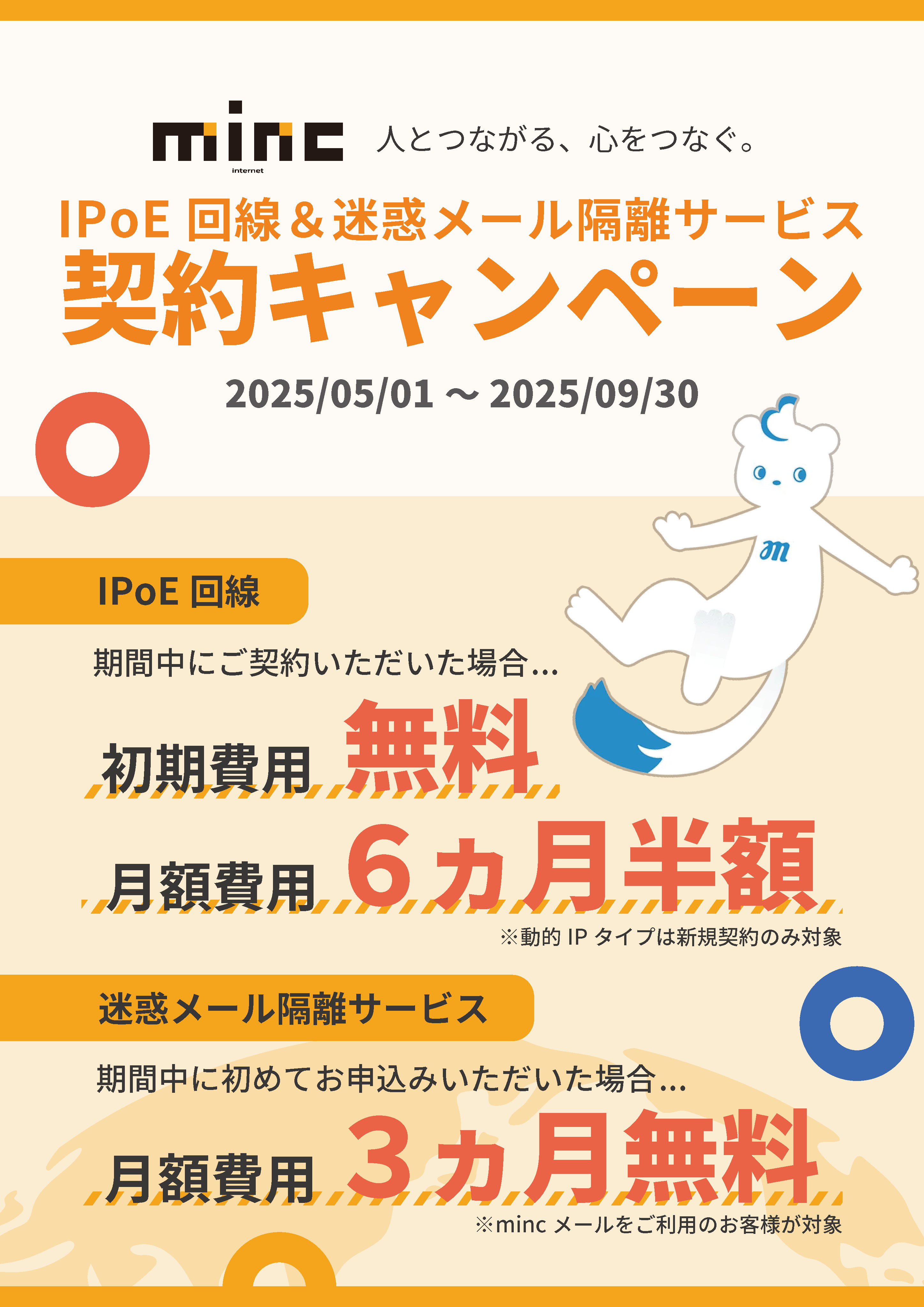 | 実施内容 | キャンペーン期間内に該当のサービスにお申込みいただくと、 以下の割引が適用されます。 ■IPoEサービス ・初期費用:無料 ・月額費用:6カ月半額 ※動的IPタイプは新規契約のみ対象となります。 ■迷惑メール隔離サービス ・月額費用:3カ月無料 ※mincメールをご利用のお客様で、迷惑メール隔離サービスを 初めてご契約頂いたお客様が対象となります。 |